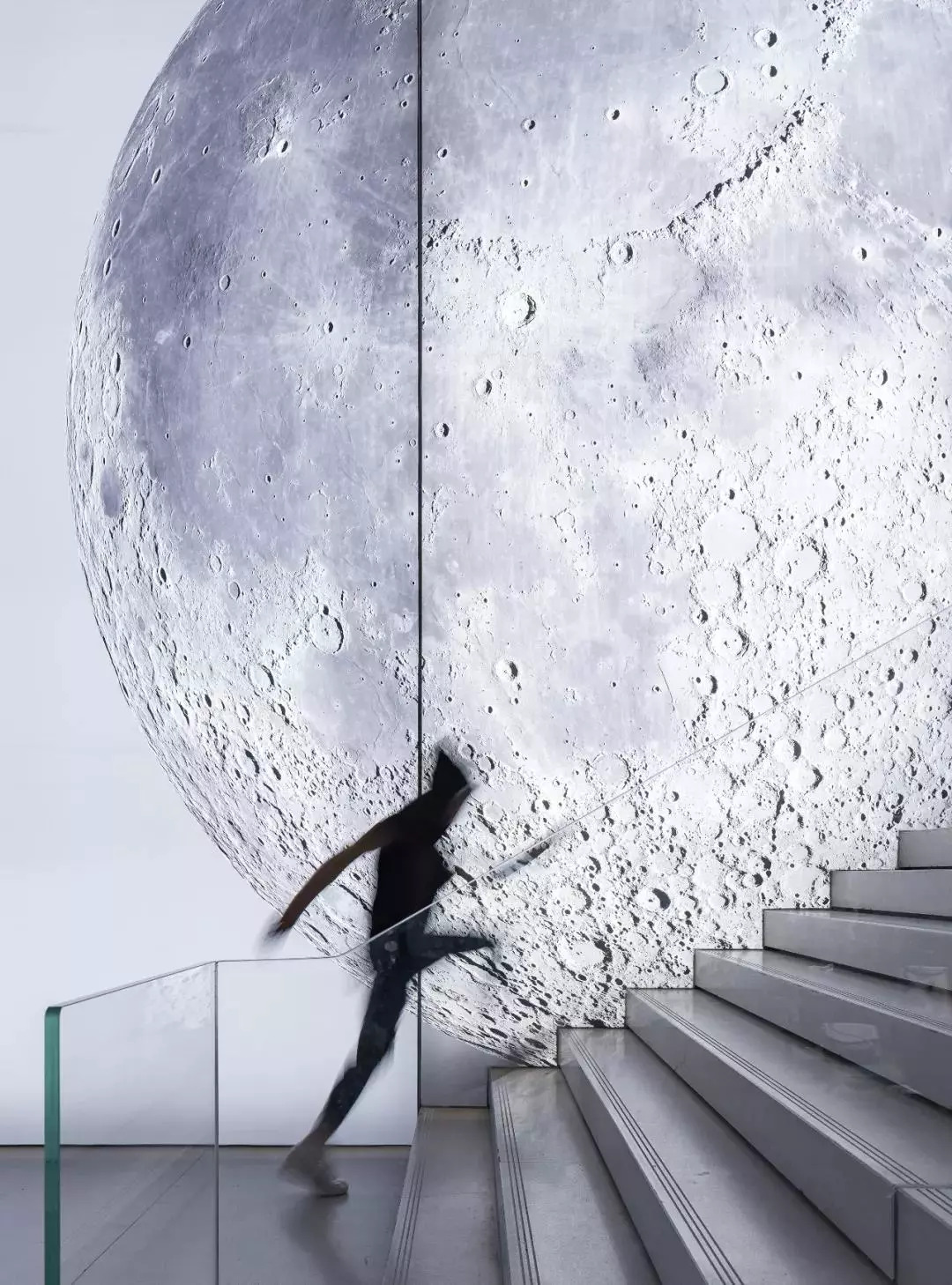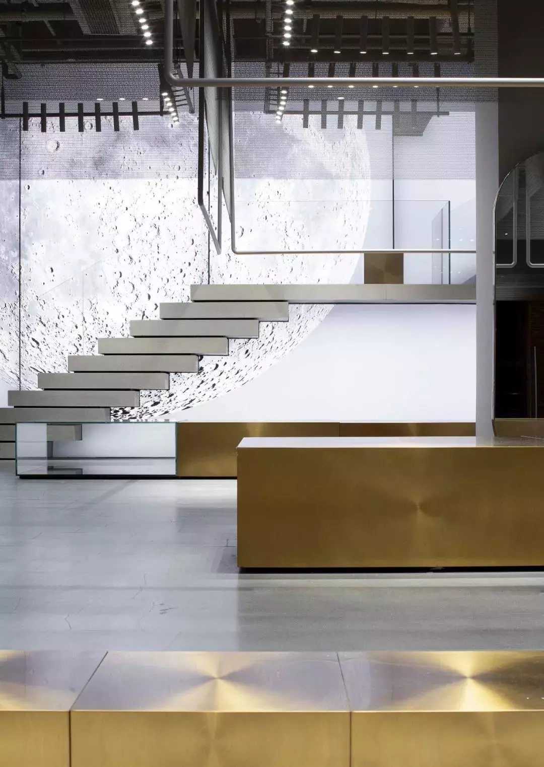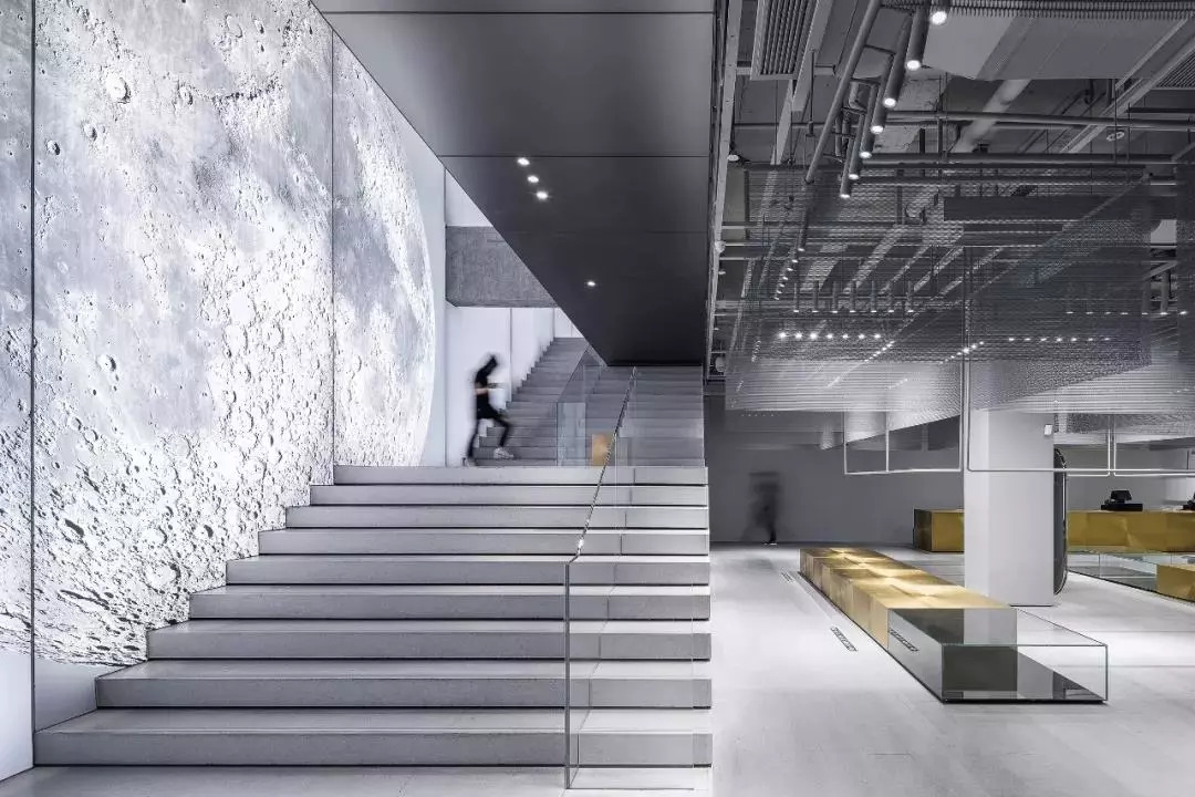 七米直径的月球位于主体店铺的正立面,即引流步梯的侧翼。如莫名昭示的少年梦境,或者出离现实的意向符号。这是继峡谷之墟后的另一记空间振奋。它是目前国内较大一轮月球。亦为大面积的二层商业空间带来高效客流引导。