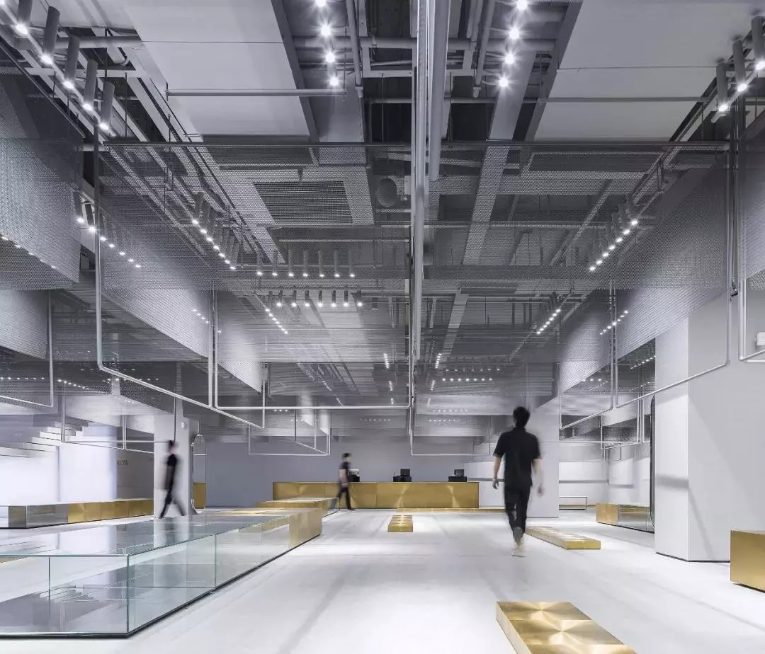 UR旗舰店的室内空间由25%灰调作为基底,形成与‘峡谷’区间空间节奏上的对比同时其重点在于通过建筑柱间模数分解成的货架道具模数,并以此形成主要人流动线的组织与引导。顶部的金属帘令原建筑保持较大程度的空间高度表现力同时适当通过人行透视线对原建固定管线进行遮挡。