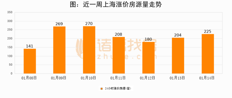 根据诸葛找房数据显示,上海24小时涨价房源量为225套,较01月13日增加21套,环比上涨10.3%。与此同时,涨价房源占比小幅扩大,业主信心有所提升。