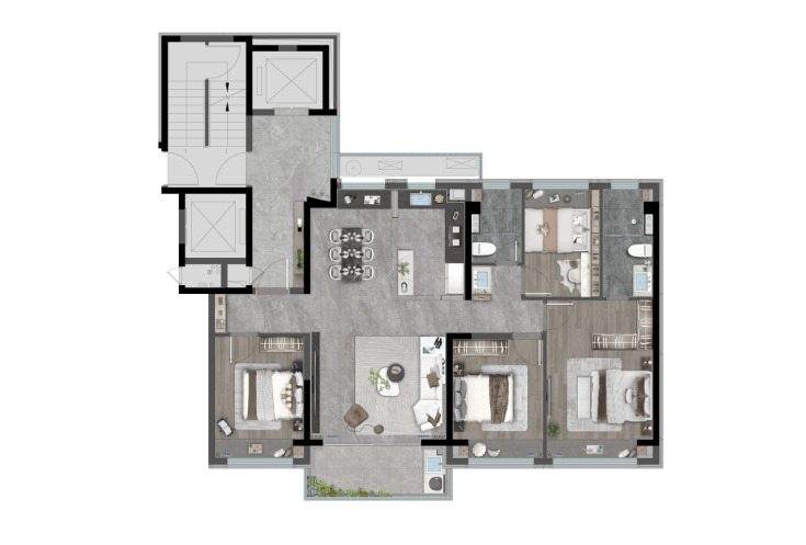 外部入户玄关,赋予鼎峯专属归家礼遇;以建筑面宽约14.2米的南向四开间设计,春夏秋冬的更迭,晨曦黄昏的变幻,皆在此从容演绎;