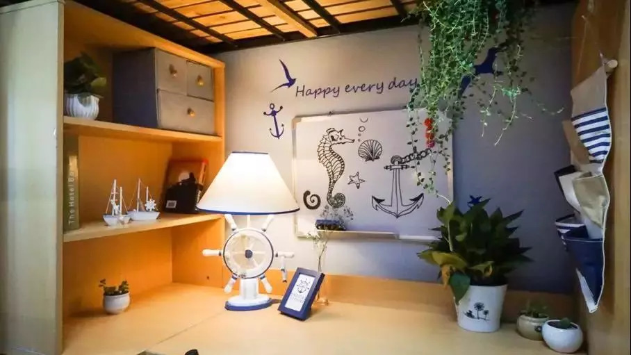 舒适的三人间,充分利用上部空间,增加储物;全封闭式窗台+梳妆镜+洗漱台;上下床+上床下桌的布局,储物间满分,满是木香和书卷气。