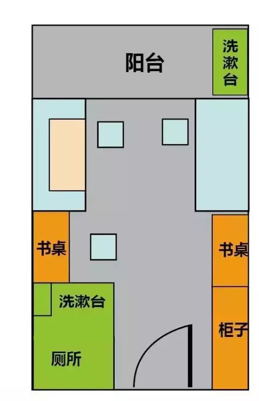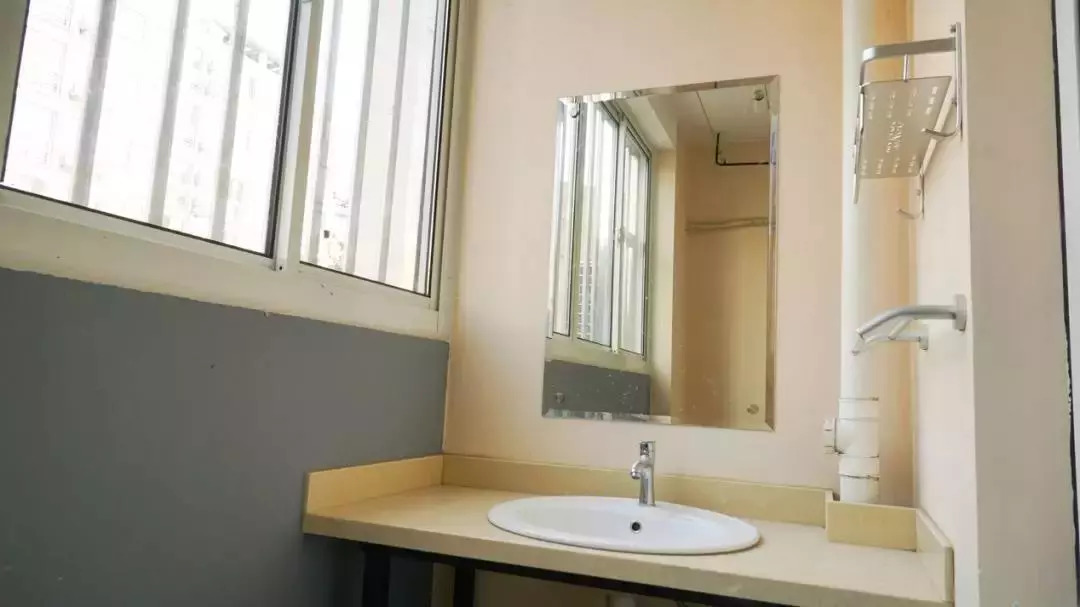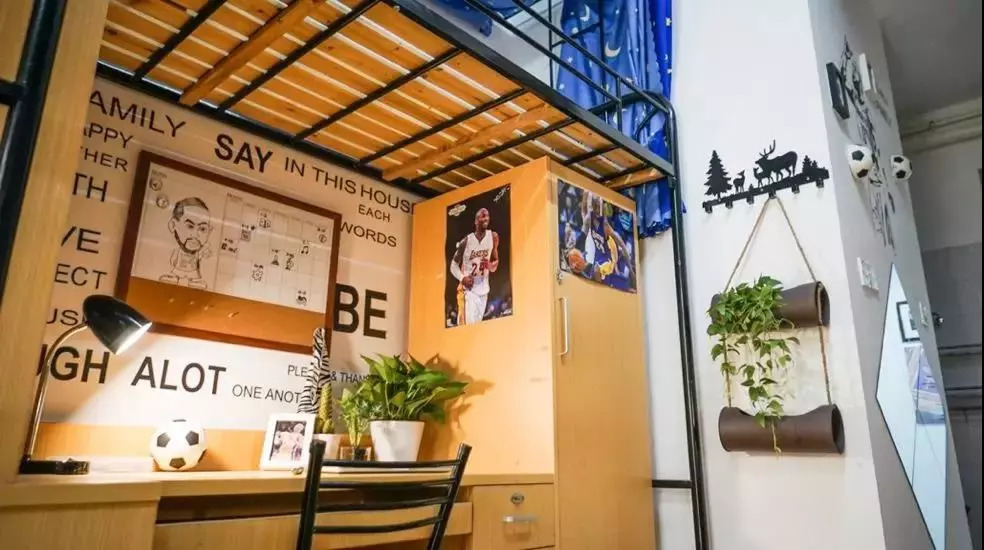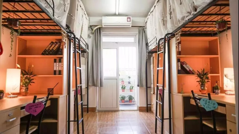 寝室四人一间,面积大,上床下桌,独立卫生间、阳台、洗漱台、储藏柜。家具齐全,生活便利,一楼有公共热水浴室。