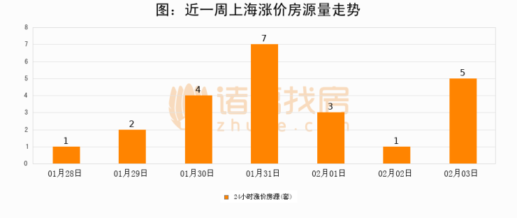 根据诸葛找房数据显示,上海24小时涨价房源量为5套,较02月02日增加4套,环比上涨400%。与此同时,涨价房源占比小幅扩大,业主信心有所提升。