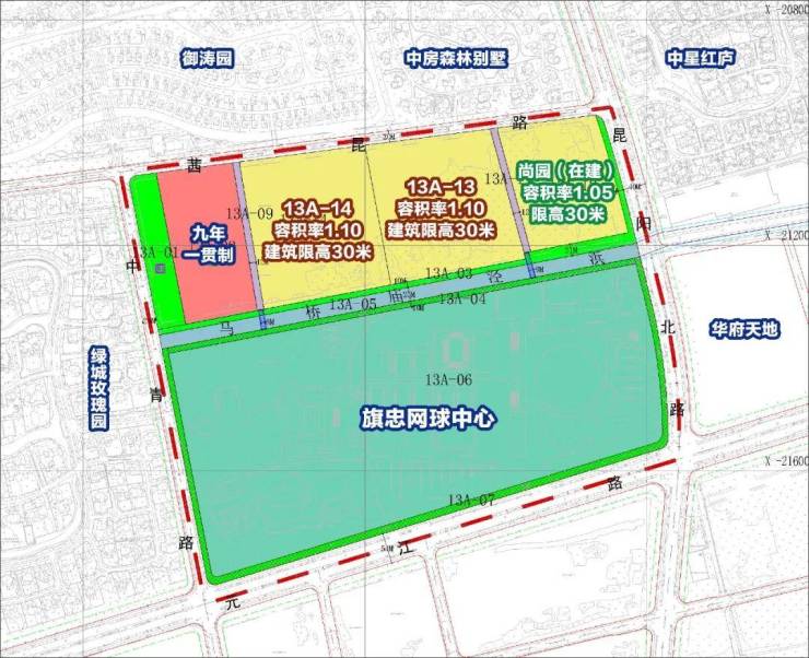 根据方案,原13A-10地块被拆分为两宗住宅用地:13A-13地块用地面积5.73万平方米,容积率1.1,建筑限高30米;13A-14地块用地面积5.87万平方米,容积率1.1,建筑限高30米。