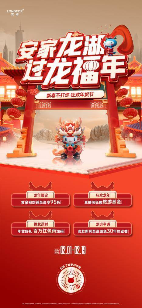 惠战一触即发,安家龙湖过龙福年——新春不打烊,狂欢年货节活动期间,推出黄金租约铺至高享95折、到访抽好礼、老友新邻至高减免30年物业费,超级性价比冠寓随心住7天只要799,全国24城150+店任性选等重磅利好。真正为大家实现好生活一步到位的舒适感,为每一位家人带去稳稳的幸福。