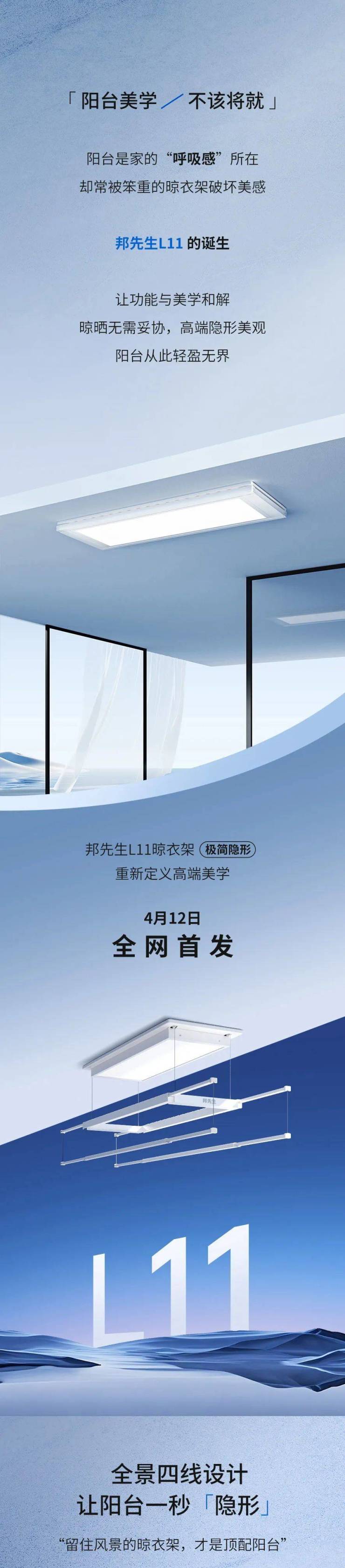阳台美学革命!邦先生L11全景四线超薄晾衣灯极简登场!