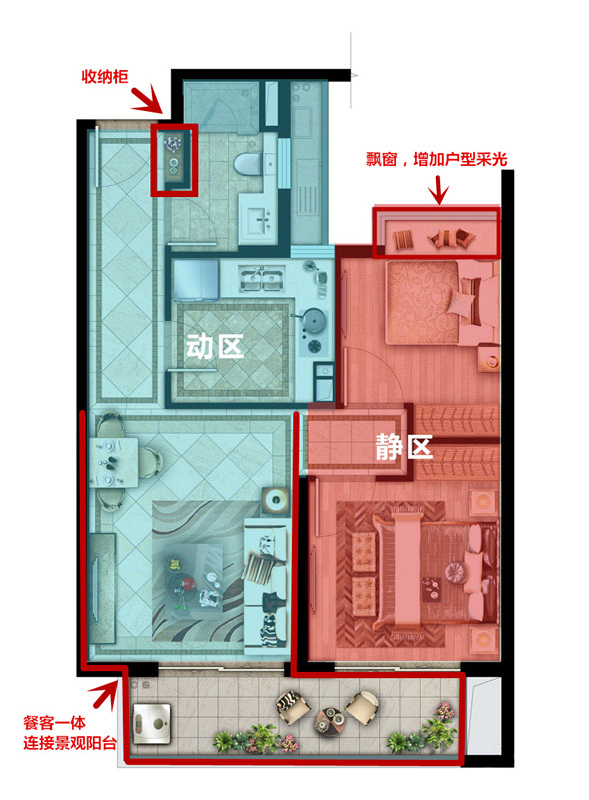 会客区与休息区相互分开互不干扰;进门后的一侧设有收纳柜;餐客一体,阳台与客餐厅相连,采光充足;主卧连接景观阳台;次卧设有飘窗,增加户型采光及通风。