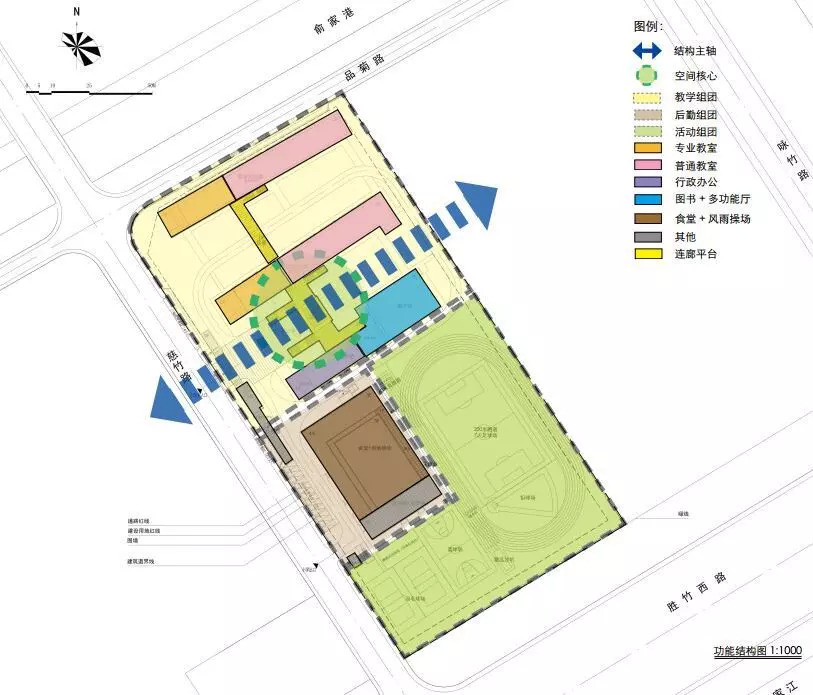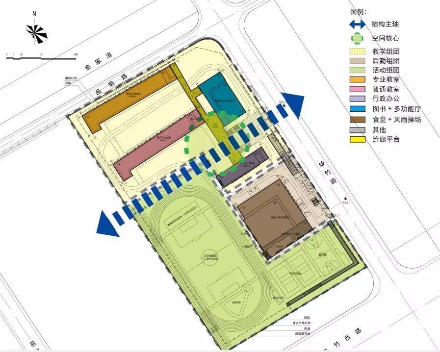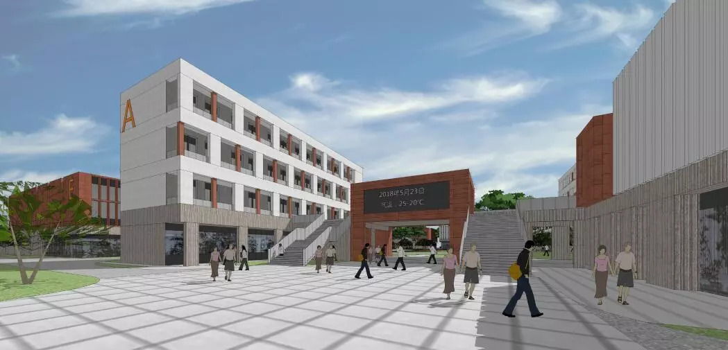 主要建筑物包括:两栋教学实验楼(5 层)、一栋行政办公楼(4 层)、一栋图书馆多功能厅(2 层)、风雨操场和一栋食堂(3 层)。