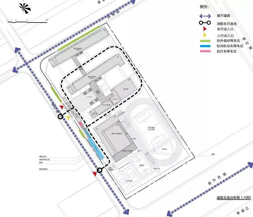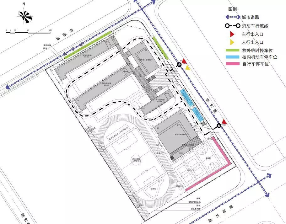 校内停车位设置在紧邻行政办公楼及后勤出入口的道路,采取沿路布置方式