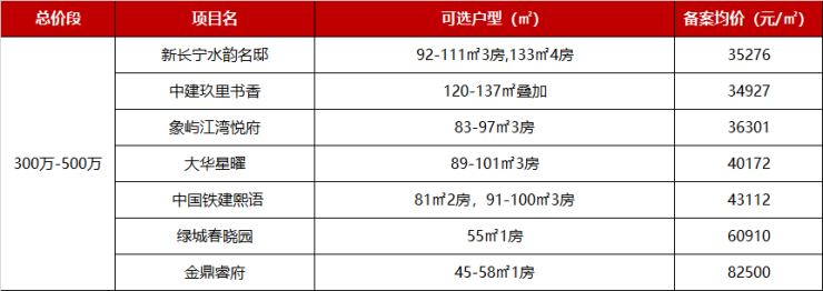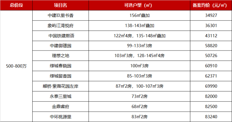 500-800万级的新盘有11个之多,这个预算既可以选择中建玖里书香、象屿江湾悦府、中国铁建熙语等项目的大户型,也可以上车永泰三里城、金鼎睿府、中环桃源里的2房产品。