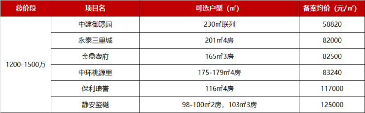 1200-1500万级的新盘有6个, 除了中建御璟园230㎡联列,还有永泰三里城、金鼎睿府、中环桃源里的大户型,保利琅誉和静安玺樾的百平户型。