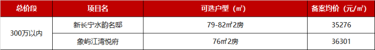 300万以内的新盘有2个,分别是位于青浦重固的新长宁水韵名邸和奉贤金汇的象屿江湾悦府。