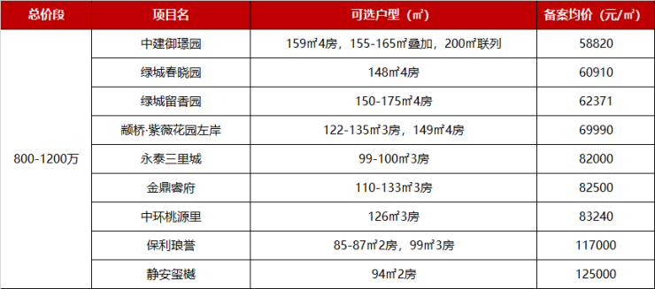 800-1200级的新盘有9个,800万预算可选绿城春晓园和绿城留香园的大户型产品,还有中建御璟园的叠加、联列产品;1000-1200万级预算可关注保利琅誉和静安玺樾的入门户型产品。