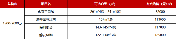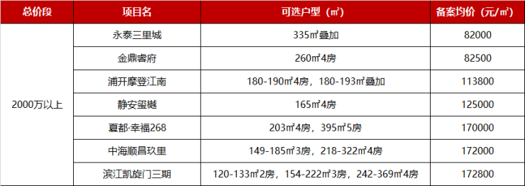 2000万级以上的7个,陆家嘴的滨江凯旋门、新天地的中海顺昌玖里、长宁的夏都·幸福268三个项目备案均价站上17万+。
