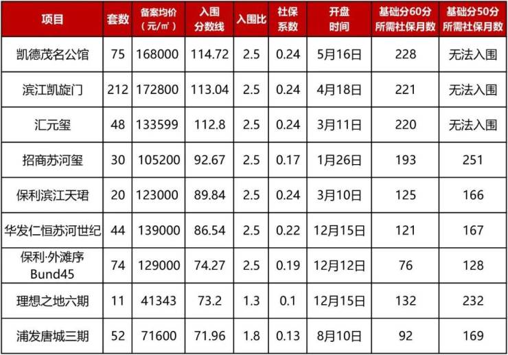 保利·外滩序BUND45位于杨浦滨江,项目74套房源吸引了530+组认购,认购率727%,这一认购率创上海2024年度最高纪录。项目入围分74.27,基础分60分需76个月社保,基础分50分需128个月社保。