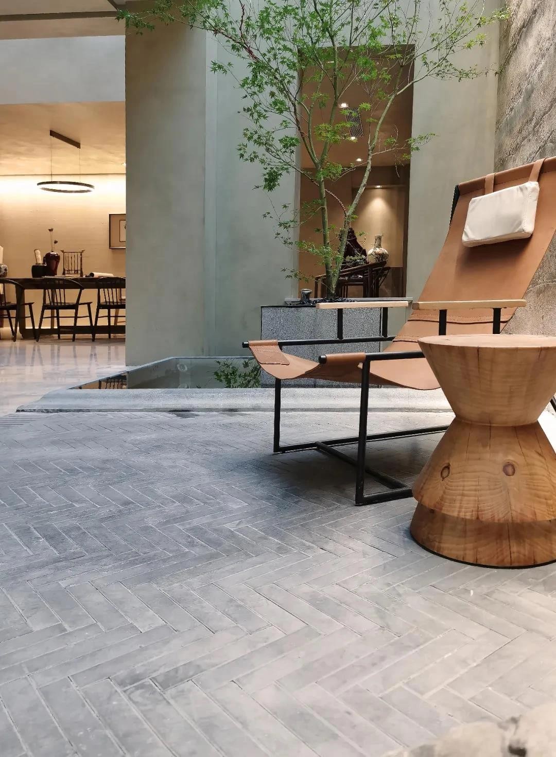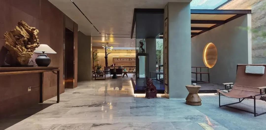 会所空间主体位于地下,为场域提供了天然的私密性。在这个项目里,设计师张建用其独创的“东方营造”设计手法,对会所空间进行探索性的重构。庭院与室内之间用一座玻璃茶亭嵌连,南北贯通,平直之间有了阴阳起伏。轻轻一瞥,庭院绿树新芽交相对望,模糊了空间的边界,恰如一个乌有之园。