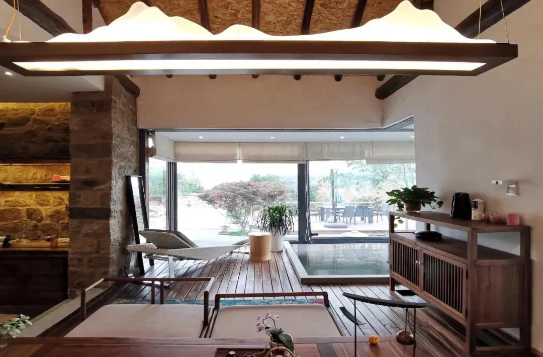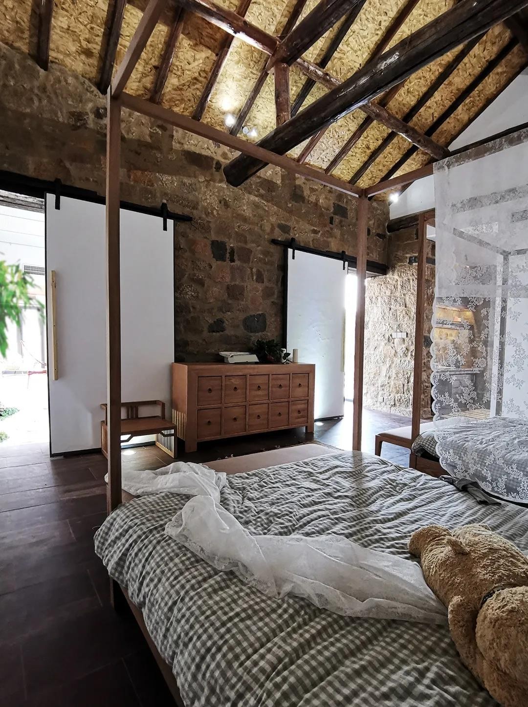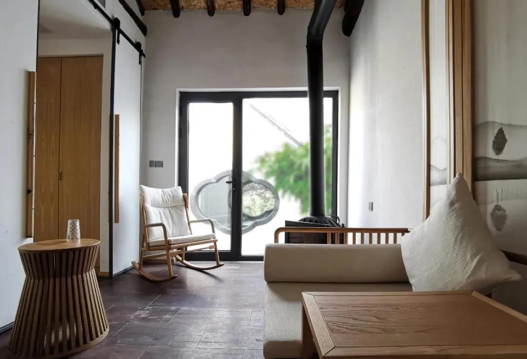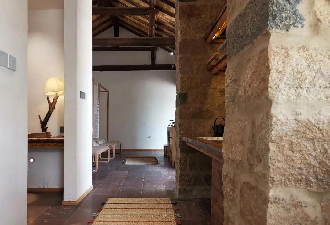 设计师张建结合天然地理优势和房屋自身条件,因地制宜、就地取材进行创作和设计。在房间的过道上,老木头的纹路感受得到岁月的痕迹,经打磨的粗粝石头结合了泰山石砌筑房屋的传统和北方的气质与砌的白墙相冲突,凸显出古朴、纯净的风格。