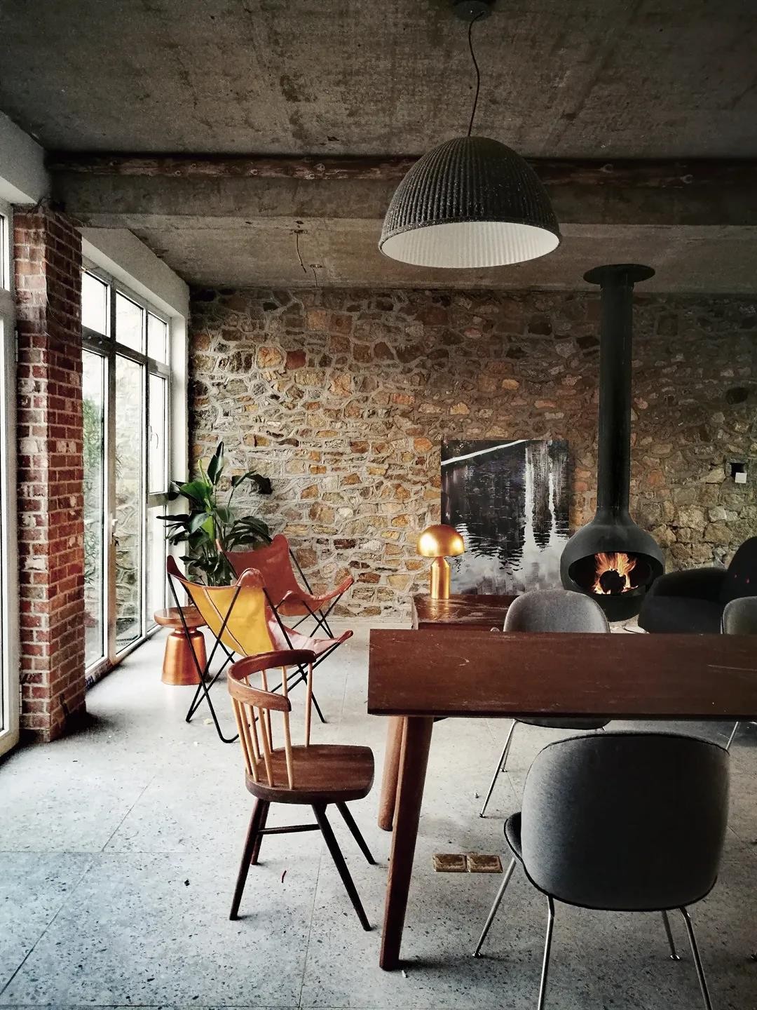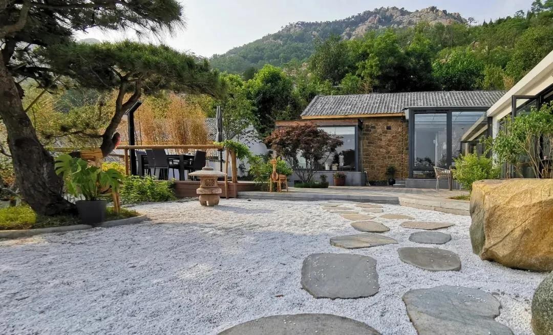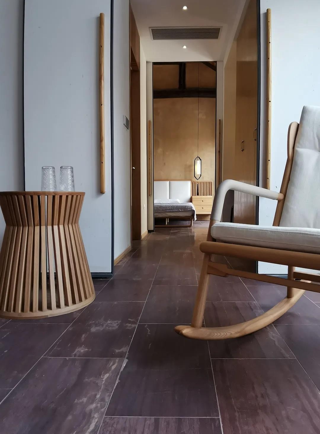 设计师张建结合天然地理优势和房屋自身条件,因地制宜、就地取材进行创作和设计。在房间的过道上,老木头的纹路感受得到岁月的痕迹,经打磨的粗粝石头结合了泰山石砌筑房屋的传统和北方的气质与砌的白墙相冲突,凸显出古朴、纯净的风格。