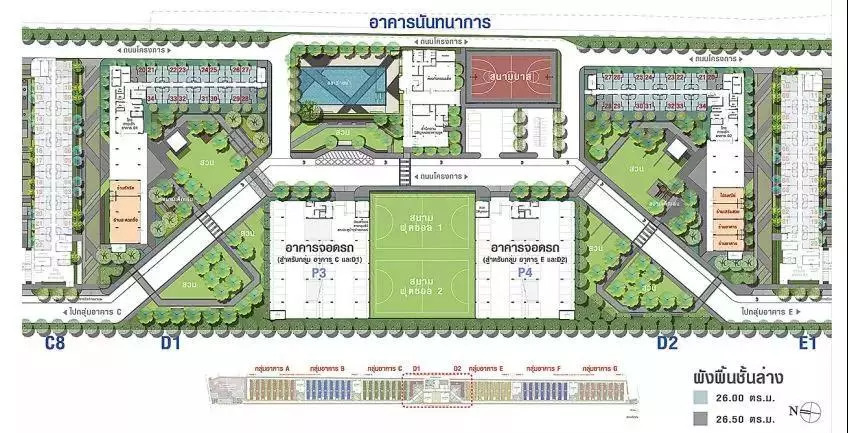 三期合计50栋8层,共一万余户,为曼谷北部较大居民区。(6栋停车场、2个足球场、1个篮球场、3栋3层公共设施楼(一楼:星级会客大厅、物业办公室,二楼:图书馆、共享工作空间、桑拿室、25米泳池、休息室,三楼:健身室、瑜伽室)。
