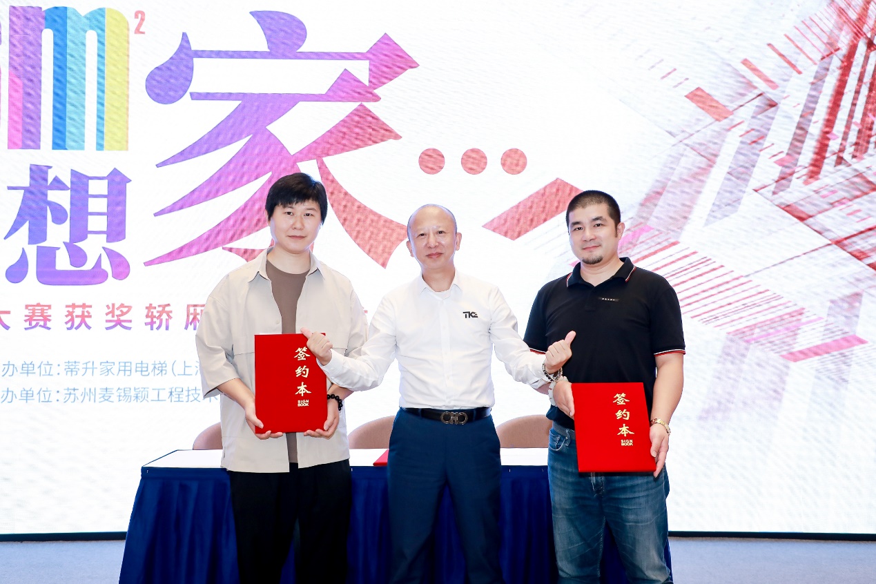 活动现场,蒂升家用电梯1.6㎡理想家设计大赛的获奖设计师许旭老师、钟其明老师与蒂升家用电梯签约。