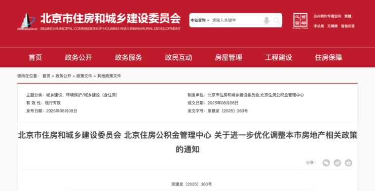 为促进北京市房地产市场平稳健康发展,更好满足居民改善性住房需求,有效发挥市场机制作用,坚持首都城市战略定位,落实好城市总体规划,8月8日,北京市住房和城乡建设委员会、北京住房公积金管理中心联合印发《关于进一步优化调整本市房地产相关政策的通知》(以下简称《通知》),自2025年8月9日起施行。