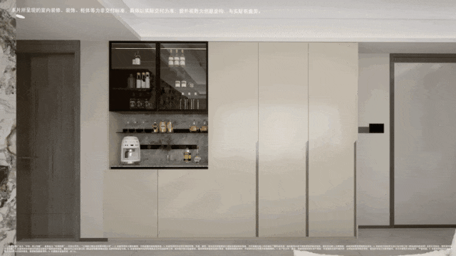 在无界户型客厅的一侧,预留整墙收纳柜的空间, 无论是家庭的咖啡角还是兴趣展示墙,都有了自由的空间,让美观性与实用性并存。