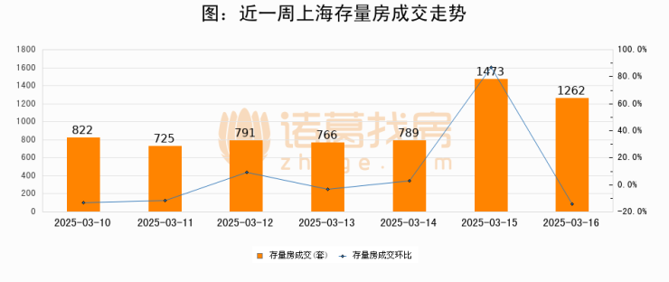 从存量房来看,2025年03月16日上海存量房单日成交1262套,比昨日减少211套,环比下降14.3%。从近一周存量房成交来看,上海存量房日均成交套数为946套,03月16日单日成交1262套,高于近一周平均水平33.4%。
