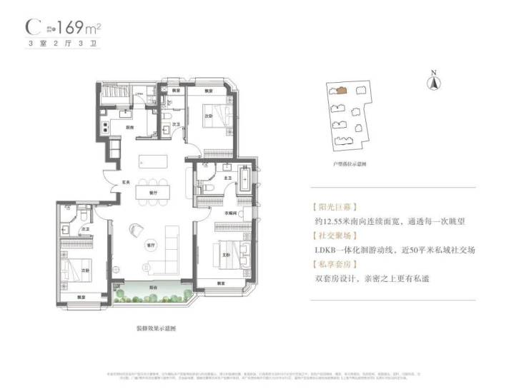 项目可售商品房预计共174套,另有22套保障房。此次过会房源共48套,主力户型有两个:建面约120㎡3房、建面约143㎡4房,即将认购。