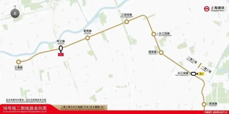 18号线二期自18号线长江南路站北端头井(不含)至大康路站,线路长约8.1公里,设车站6座,