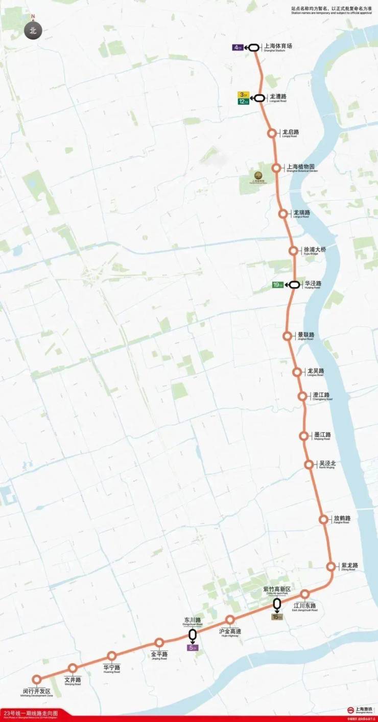 23号线一期是新一轮轨道交通线网中新增的市区线路,串联了闵行开发区、紫竹高新区、吴泾转型地区、徐汇滨江地区等重要区域,途经闵行区和徐汇区两大行政区,线路全长约28.6公里,共设22座车站。