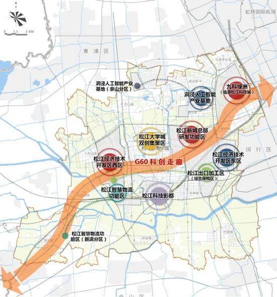 在上海科创版图中,松江G60科创走廊占据龙头位置,在G60高速两侧形成“一廊九区”的布局,集聚40多家世界500强,如巨人网络、腾讯AI、海尔智谷、脑智基地等,聚集了松江约90%的工业产值,占上海工业产值近10%。