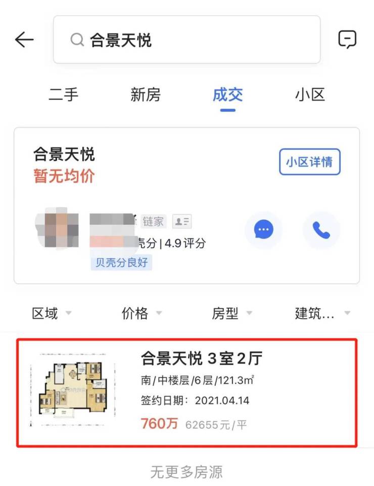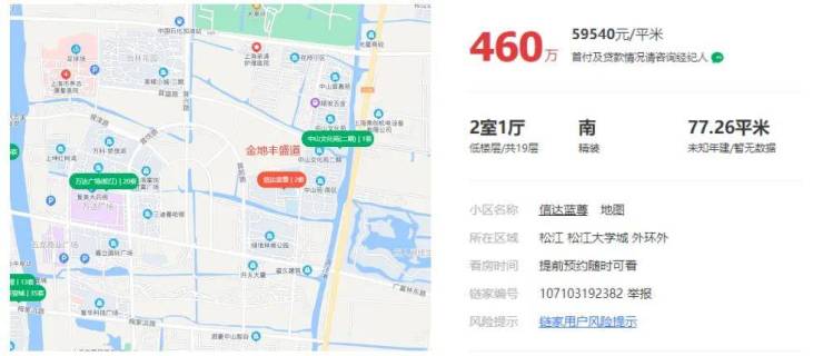 由于二手房核验价的存在,诸多挂牌价已经不能反应当下市场的真实情况了,但是我们还是可以从过往的成交记录找到部分蛛丝马迹。据贝壳显示:在2021年4月14日,同样位于松江新城内的合景天悦,二手成交价来到了约 62655元/㎡!