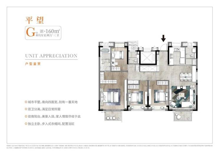 免责提示:此为金地丰盛道项目G户型(15-44-801室)标准户型示意图,建筑面积约160㎡。相同户型因楼栋、楼层、朝向等的不同,其立面设计、内部结构、管线管井布置、建筑面积等亦有不同。本户型图不作为要约或承诺,仅供装修参考示意,并非实际交付标准,房屋交付标准以双方签署的购房合同为准。本户型图相关功能区仅供展示,存在因政府规划变更或特殊户型而导致的差异。