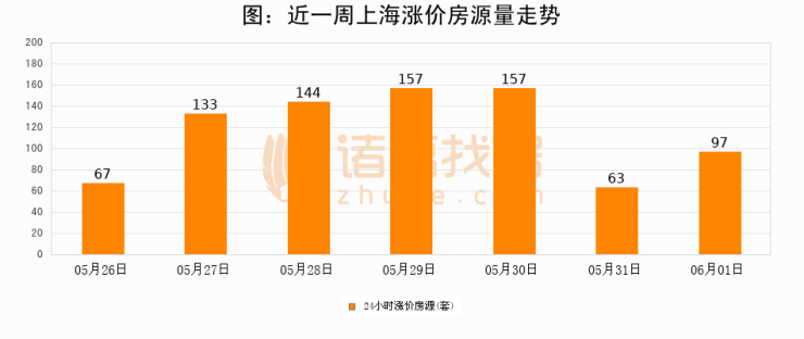 根据诸葛找房数据显示,上海24小时涨价房源量为97套,较05月31日增加34套,环比上涨54%。与此同时,涨价房源占比小幅扩大,业主信心有所提升。