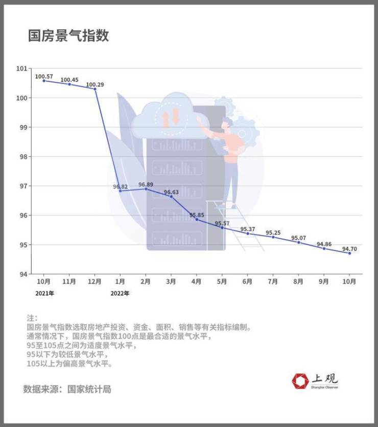 整体上来看,除在本年年初略有回暖外,一年来,房地产开发景气指数基本呈下跌趋势,且在9月、10月均跌至95以下,这代表着房地产市场处于较低景气水平。