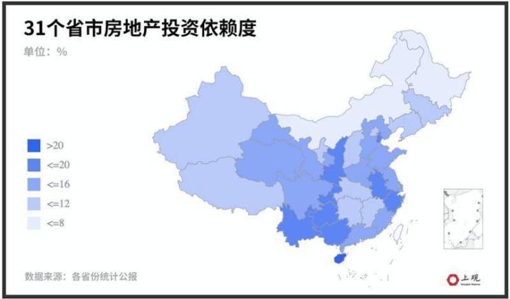在31个省份中,海南的房地产依赖度为24.3%,是唯一一座高于20%的城市。贵州排在第二位,依赖度为19%。此外,浙江、重庆、广西、陕西、四川等10个省市的依赖度,也均超过了15%,其中西部省份占比较大。