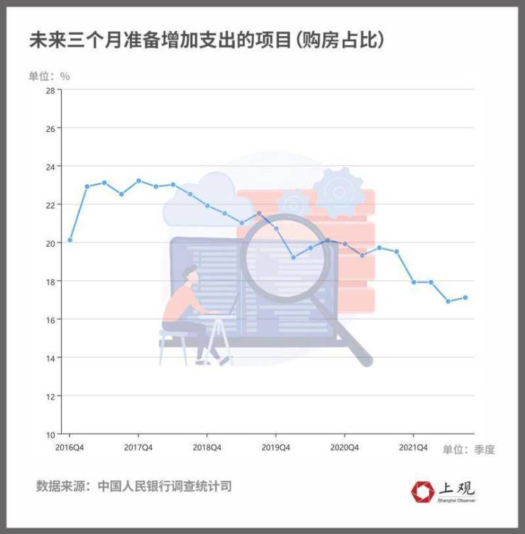 具体来看,在居民欲增加支出的项目中,选择购房的占比基本呈下降趋势,近一年来始终在18%以下。而教育(30.0%)、医疗保健(27.2%)、大额商品(19.4%)是居民们更愿意增加支出的项目。