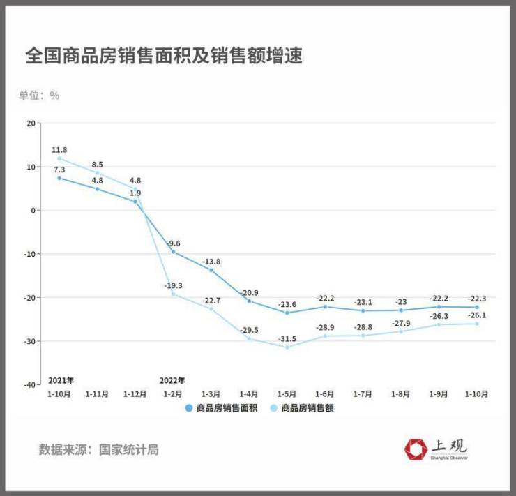 2022年,全国商品房销售面积、销售额一路下滑。1—10月份,商品房销售面积111179万平方米,同比下降22.3%,其中住宅销售面积下降25.5%。商品房累计销售额108832亿元,下降26.1%,其中住宅销售额下降28.2%。