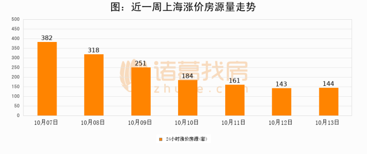 根据诸葛找房数据显示,上海24小时涨价房源量为144套,较10月12日增加1套,环比上涨0.7%。与此同时,涨价房源占比小幅扩大,业主信心有所提升。