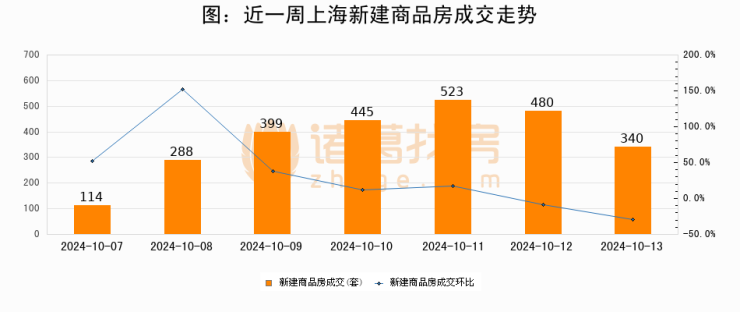 根据上海市房地产交易中心数据显示,2024年10月13日上海新建商品房成交340套,较昨日减少140套,环比下降29.2%