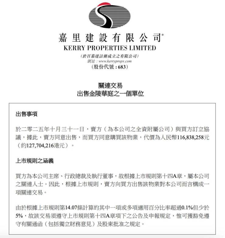 10月31日,嘉里建设发布公告称,公司董事会主席、行政总裁及执行董事郭孔华与全资附属公司上海卓妙置业签订购房协议,以约1.17亿元购入黄浦区金陵华庭一套四室房源。