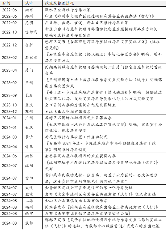 根据中指研究院不完全统计,仅今年以来,就有超40城出台落地“房票安置”政策,其中广州、上海均由郊区启动试点推进,目前均已有少量房票发放使用,未来房票安置政策有望进一步扩围并落地。