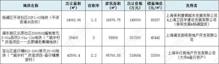 其中,保利发展联手杨浦国资委,拿下平凉街道45街坊历史保护项目;浦发、大华分食浦东北蔡和宝山庙行2宗城中村地块。