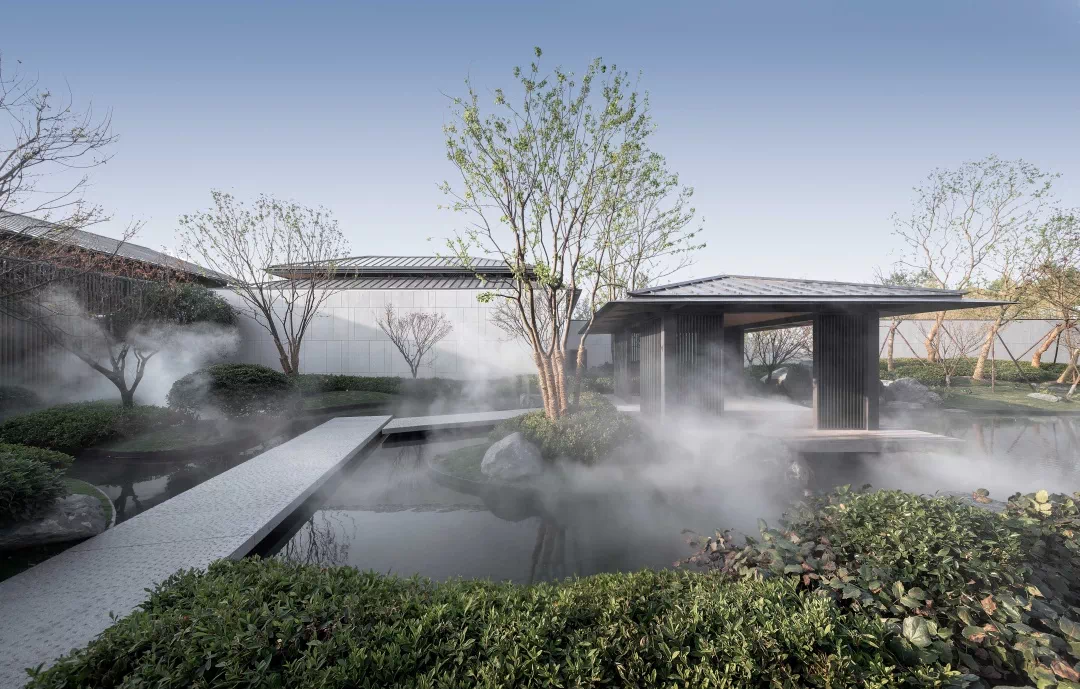 山水拾间采用极简式的中式风格,外立面采用米白色仿石漆+金属铝板,屋顶瓦片也采用深色,整体颜色风格结合巷道的绿化与水景,营造出传统的江南水乡似的氛围。