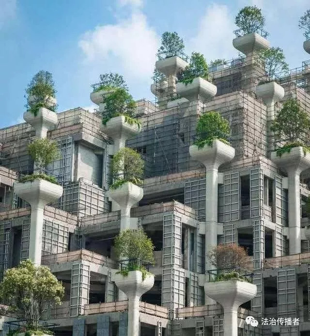 整座建筑依水而建,建筑呈不规则形状,底层面积较大,越是往上楼层面积依次减小。整体看上去参差错落,有点梯田的影子。每一层建筑外面都遍布着一个承台,承台上是专门用来种植绿植的,计划整栋建筑种植一千颗树。绿色茂密的树冠将建筑包裹起来,远看就像是一座青山,打造出了“依山傍水”的意境。