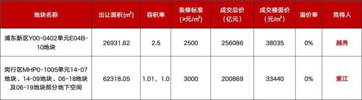其中,越秀以256086万元底价拿下浦东森兰地块,溢价率0%,楼板价38035元/㎡。