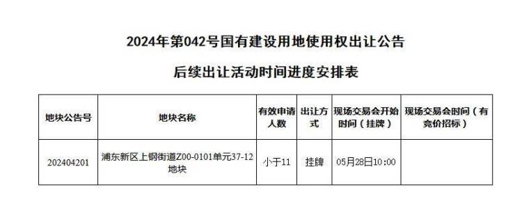 浦东新区上钢街道Z00-0101单元37-12地块有效申请人数小于11人,确定采用挂牌方式出让,现场交易会开始时间安排在5月28日10:00。