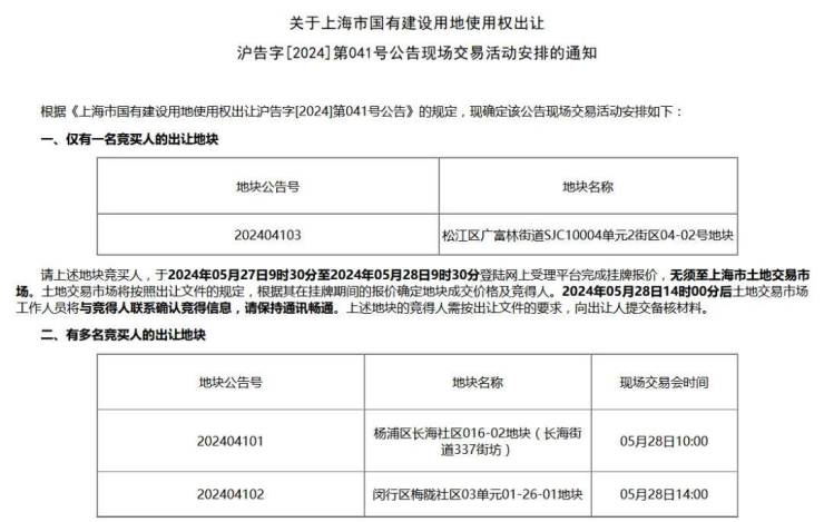 松江区广富林街道SJC10004单元2街区04-02号地块仅有一名竞买人,不组织现场交易会;杨浦区长海社区016-02地块(长海街道337街坊) 、闵行区梅陇社区03单元01-26-01地块分别将于5月28日10:00、5月28日14:00进行现场交易。