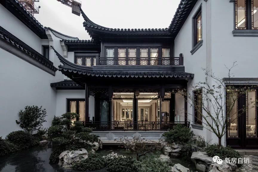 上海桃花源打造护城河-水巷-中心湖(池)-私家庭院池的四重水系,借由月洞门、花窗以及一些中式小品相互渗透,形成一个流动的景观。中心庭院的湖景以静态水景为主,以咫尺池塘模仿烟波浩渺的自然境界。