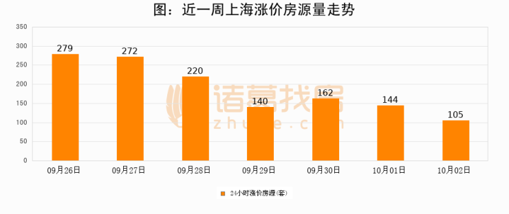 根据诸葛找房数据显示,上海24小时涨价房源量为105套,较10月01日减少39套,环比下降27.1%。与此同时,涨价房源占比小幅回落,对于购房者来说是一个入市窗口期,购房者可抓住时机入市。